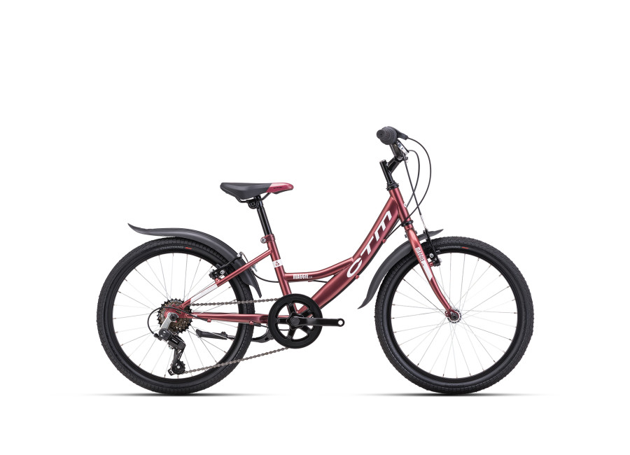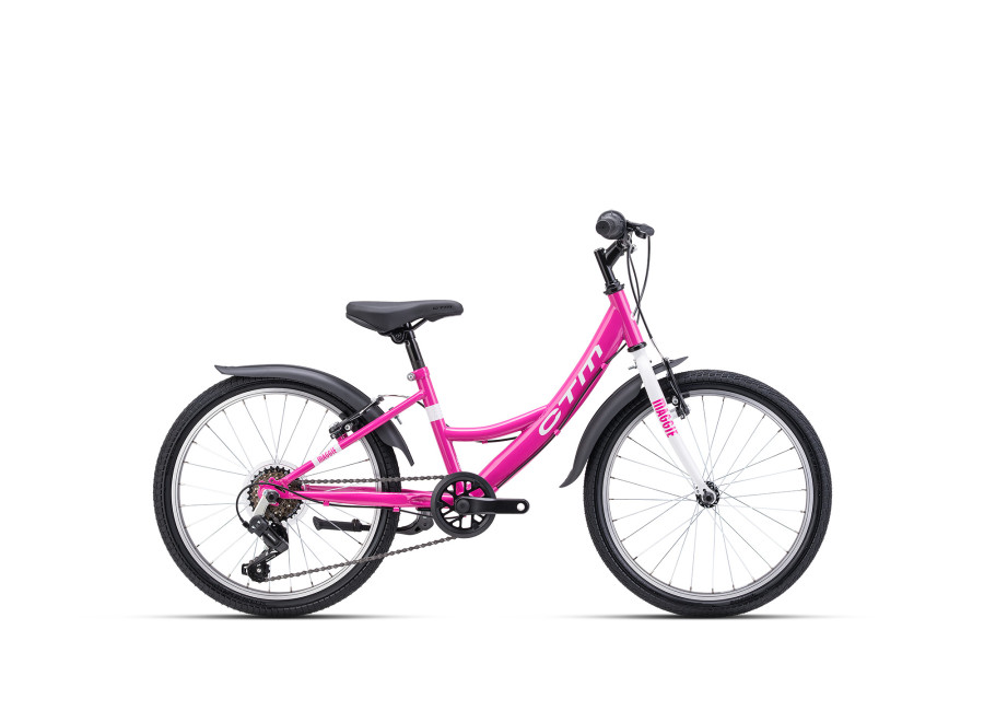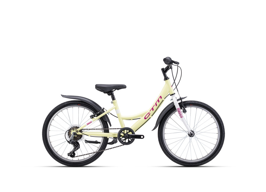 20" detský dievčenský bicykel s 11" Hi-Ten rámom (vhodný pre deti vo veku 5-9 rokov) . Bicykel vybavený SHIMANO TOURNEY s radením REVOSHIFT (6 prevodov), V-Brake brzdami, spevnenými AL ráfikmi a stojanom. Zaujímavé farby rámov: pútavá ružová, jemná lososová, elegantná fialová a pistáciovo zelená.
